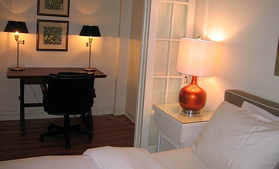 This studio has a beautifully upholstered queen-sized bed, a comfortable sitting area and a work space with a desk or table. The full kitchen has a stove with oven, full refrigerator, microwave and a Keurig coffee maker. The tiled bathroom has a tub and shower. YOUR ARRIVAL TIME IS VERY IMPORTANT TO US, PLEASE CONTACT US. NO CHECK-INS AVAILABLE AFTER 10PM.